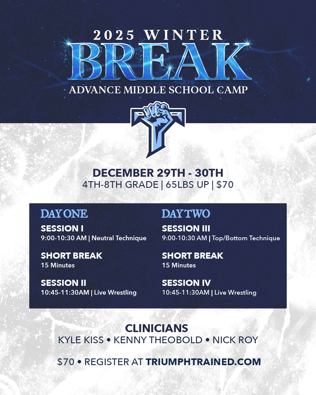 Open to all must be at least 65lbs and up. Camp will be high-level and intense geared towards more serious youth and middle school wrestlers. Please see schedule and registration below. Cost will be $70 per camper, sibling discount available.